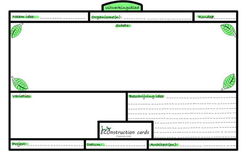 Dit is de toolkit: ‘’ECOnstruction cards’’. Dit is een toolkit die helpt biomimicry toe te passen in de architectuur. Biomimicry is een oude wetenschap die de natuur bestudeert en daaruit inspiratie haalt. De natuur is in miljarden jaren geëvolueerd naar wat werkt. Van deze strategieën kunnen mensen leren, zoals bijvoorbeeld Leonardo da Vinci dat deed.